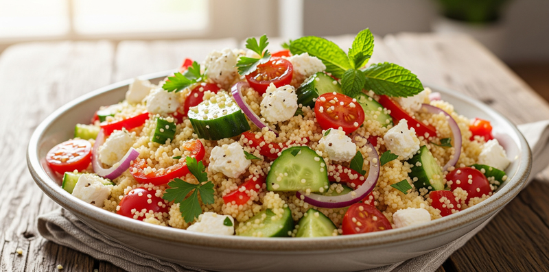 Met ongeveer 400 kcal is dit een lichte maar vullende lunch. De feta geeft een zoute, romige smaak, terwijl de groenten zorgen voor kleur en bite. Couscous neemt makkelijk smaken op, dus laat de salade even staan voor extra smaak.
