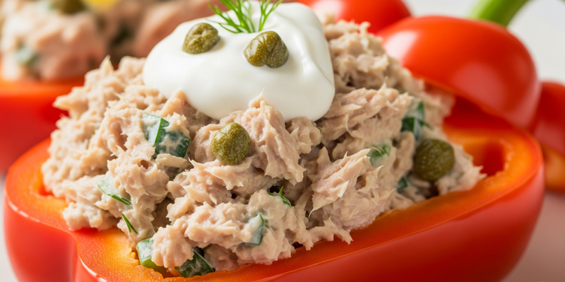 Met slechts 200 kcal is dit een lichte lunch die toch goed vult. De paprika geeft een zoete, knapperige basis. De tonijn levert veel eiwitten en de yoghurt houdt het fris.