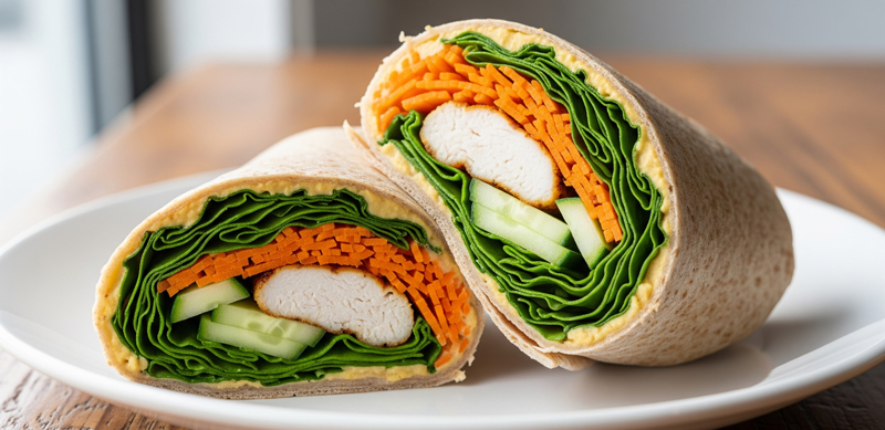 Een volkoren wrap is een fijne basis voor een snelle, voedzame lunch. Beleg hem met 50 gram hummus, 80 gram gegrilde kipfilet, een hand verse spinazie, wat komkommer en geraspte wortel. Rol de wrap stevig op en snijd hem doormidden voor makkelijk eten.